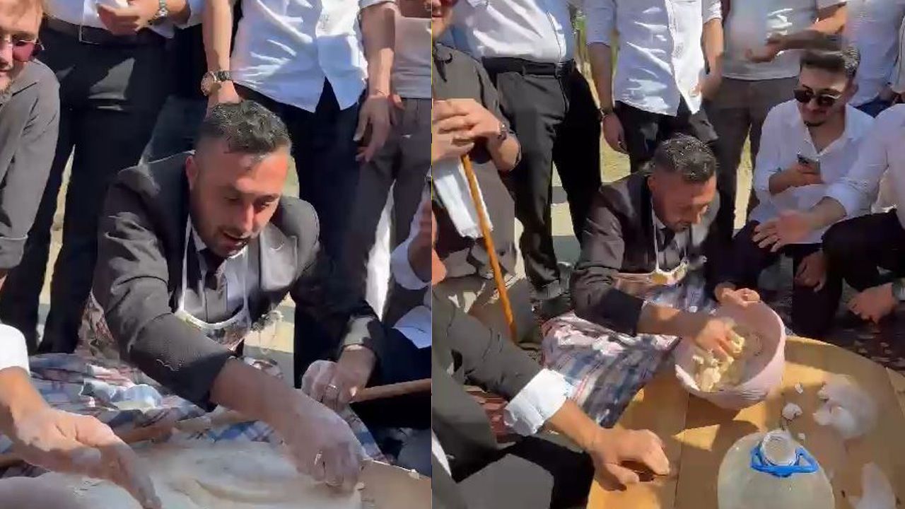 Merkeze bağlı Yaka köyünden gelin alındıktan sonra dönüş yoluna geçen düğün konvoyu, köy çıkışında sürpriz bir şekilde durduruldu. Damat Recep Vural’ın arkadaşları, geleneksel eğlenceleri yaşatmak amacıyla yolu yer sofrası kurarak kesti. Yere serilen sofranın başına oturtulan damat, önce hamur yoğurdu, ardından eline verilen oklavayla hamur açtı. Hazırlanan hamurlar, taşınabilir tüpte kızartılarak konvoydakilere ikram edildi. O anlar cep telefonu kamerasıyla kaydedildi.