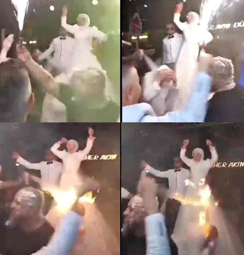 Mersin'in Silifke ilçesinde gerçekleştirilen düğün merasiminde yaşanan olay, konuklardan birinin cep telefonu kamerasına yansıdı. Sosyal medyada da paylaşılan görüntülerde, düğün merasimi sırasında düzenlenen eğlencede gelin ve damat pistte oynadığı sırada köpüklü ve meşaleli şov gerçekleştirildiği anlar yer aldı. Eğlence sırasında kafasına köpük sıkılan bir kişinin saçlarının, elde gezdirilen meşaleden sıçrayan kıvılcımlar nedeniyle alev aldığı anlar da görüntülere yansıdı. Kısa süreli paniğin yaşandığı olayda, saçları alev alan kişi alevleri eliyle söndürerek yanmaktan kurtuldu.