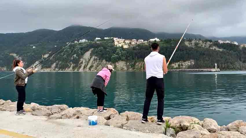 BARTIN (İHA) - Bartın'ın Amasra ilçesinde limana balık sürüsünün girdiğini duyan mendireğe akın etti. Sabahın ilk ışıklarında olta misinesini kapan kadın, erkek herkes balık avladı.