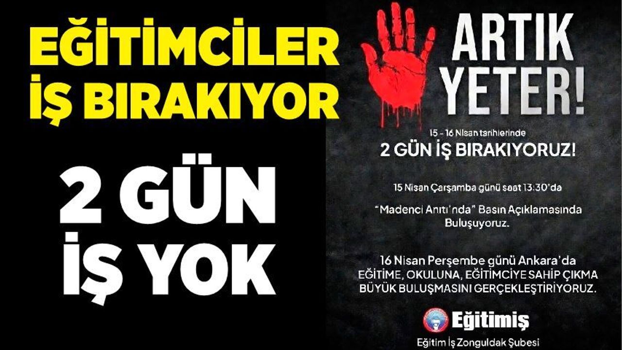 Eğitim ve Bilim İşgörenleri Sendikası (Eğitim-İş) Zonguldak Şubesi, eğitim sistemine yönelik sorunlara dikkat çekmek amacıyla 2 gün iş bırakma kararı aldığını duyurdu.