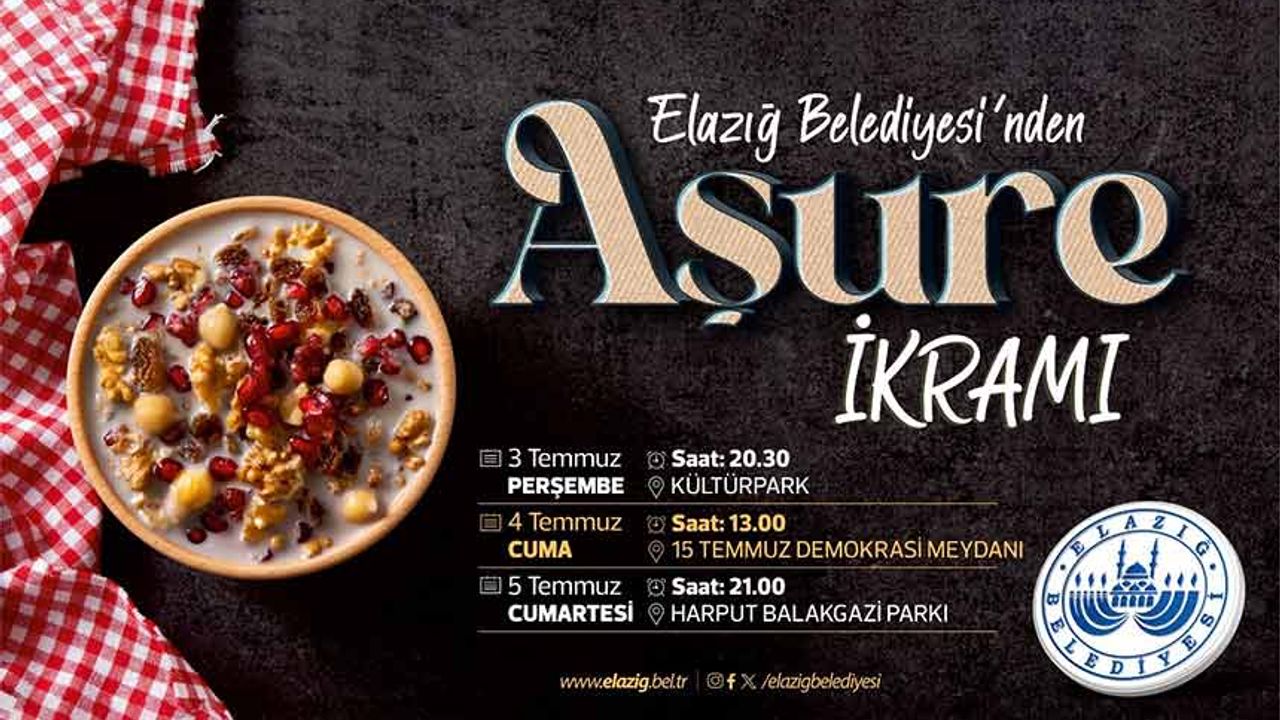 Aşure ikramlarının ilki bugün saat 20.30'da Kültür Parkta gerçekleştirilecek. 4 Temmuz Cuma günü ise aşure saat 13.00'te 15 Temmuz Demokrasi Meydanında dağıtılacak. 5 Temmuz Cumartesi akşamı ise saat 21.00'de aşure ikramı, Harput Balakgazi Parkında yapılacak. Böylece Elazığ Belediyesi tarafından üç gün boyunca ve üç farklı noktada aşure ikram etme geleneği sürdürülmüş olacak.