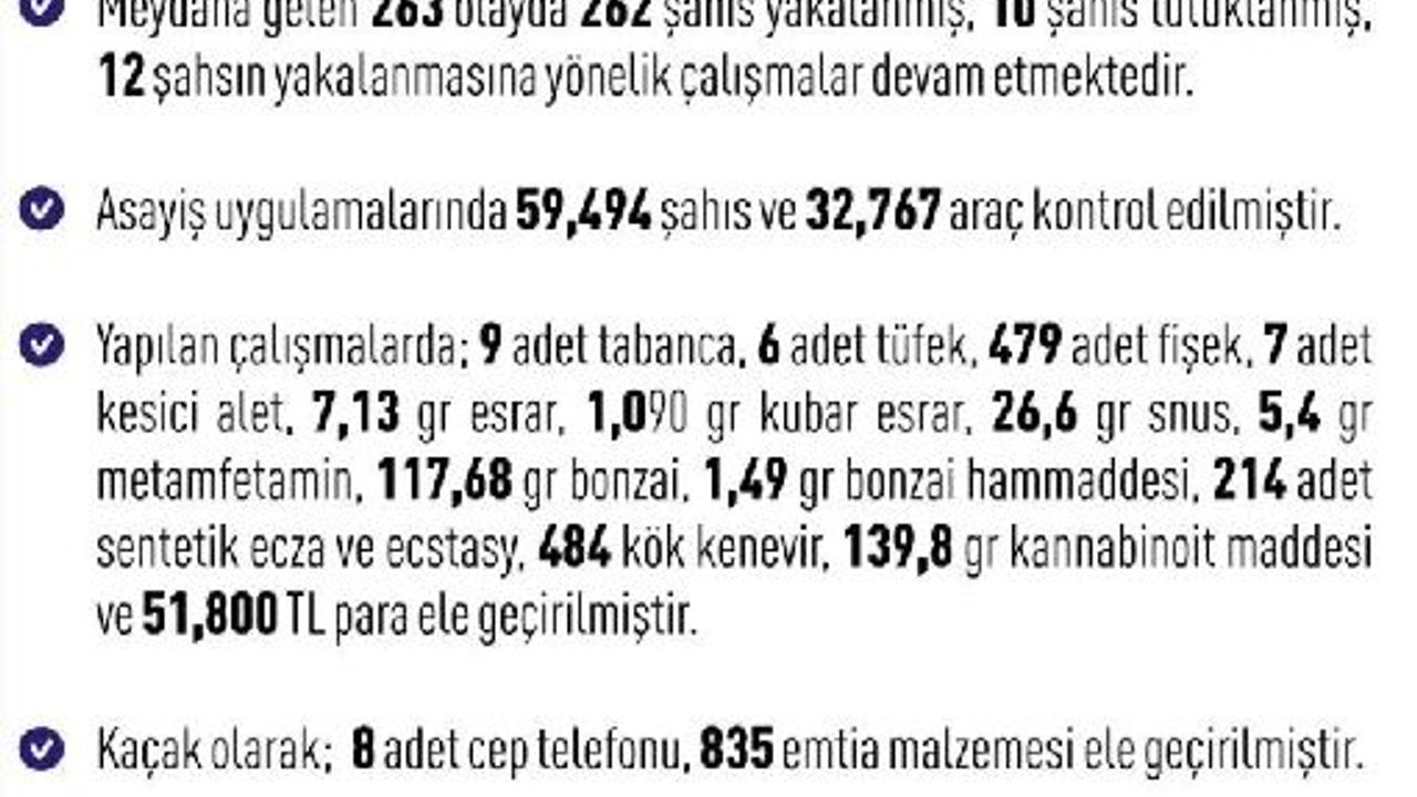 Yapılan çalışmalarda 9 adet tabanca, 6 adet tüfek, 479 adet fişek, 7 adet kesici alet, 7,13 gram esrar, 1,090 gram kubar esrar, 26,6 gram snus, 5,4 gram metamfetamin, 117,68 gram bonzai, 1,49 gram bonzai hammaddesi, 214 adet sentetik ecza ve extacy, 484 kök kenevir, 139,8 gram kannabinoit maddesi ve 51 bin 800 lira para ele geçirildi. Kaçak olarak, 8 adet cep telefonu, 835 emtia malzemesi ele geçirildi. Kent genelinde 42 adet trafik kazasında 85 kişi yaralanırken 1 kişi de hayatını kaybetti.