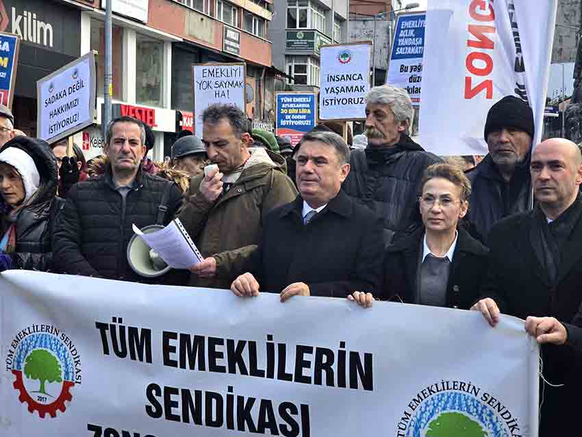 Bu kış şartlarında emeklilerimiz hiç değilse bir bardak çay, bir sıcak çorba içebilsinler! Soğukta yorganlara, battaniyelere sarılmak yerine, evlerini ısıtabilsinler, "bir lokma, bir hırkaya" muhtaç kalmasınlar diye, her emeklinin aylığına 20 000 lira seyyanen zam yapılması için çağrıda bulunduk. Kolay kolay duymazlar diye her gün Türkiye'nin ortalama 45-50 noktasında alanlarda, demokratik mücadelenin bütün imkanlarıyla sesimizi çıkardık. Dünya duydu. Saraylarında, sırça köşklerinde, gününü gün eden iktidar duymadı. İşte halktan kopmak böyle bir şeydir. CHP milletvekilleri 12 gündür TBMM'ni terk etmeyip, oturma eylemi yapıyorlar, iktidar yine görmüyor. Şov yapıyorsunuz diyecek kadar duyularını yitirmişler.En düşük emekli aylığını 1062 lira arttırarak, en düşük emekli aylığı alanları 4 milyondan, 4,9 milyona çıkardılar. Başka bir deyişle en düşük emekli aylığı alan emekli sayısı toplamda yaklaşık yüzde 30'u buldu. Yani tüm emeklileri en dip aylıkta eşitlemeye çalışıyorlar!