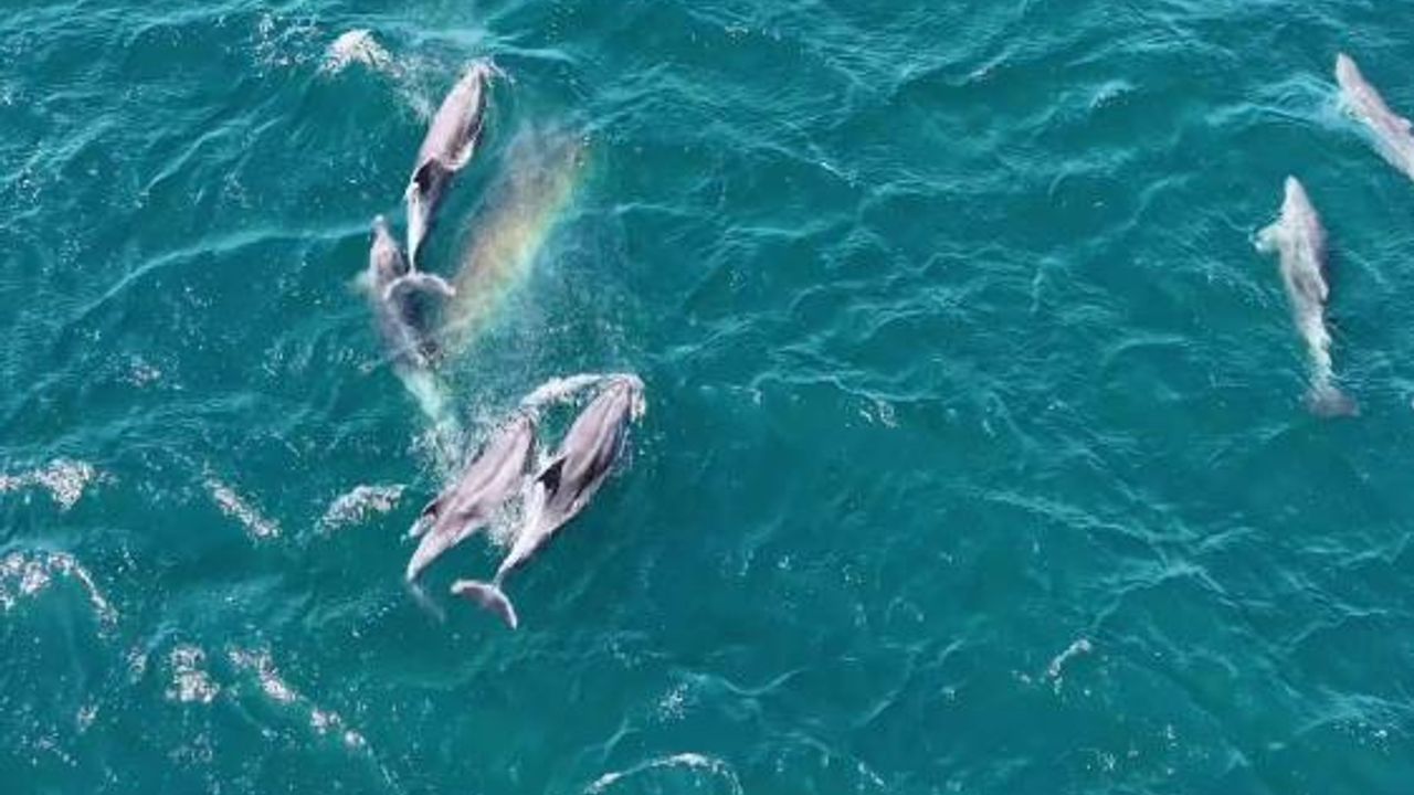 Erdek Körfezi'nde 6 adet yunus, suyun altında kaybolup tekrar yüzeye çıkarak adeta görsel şölen sundu. O anlar dronla da kaydedilirken, yunuslar kısa süre sonra gözden kayboldu.