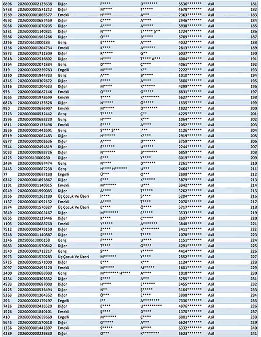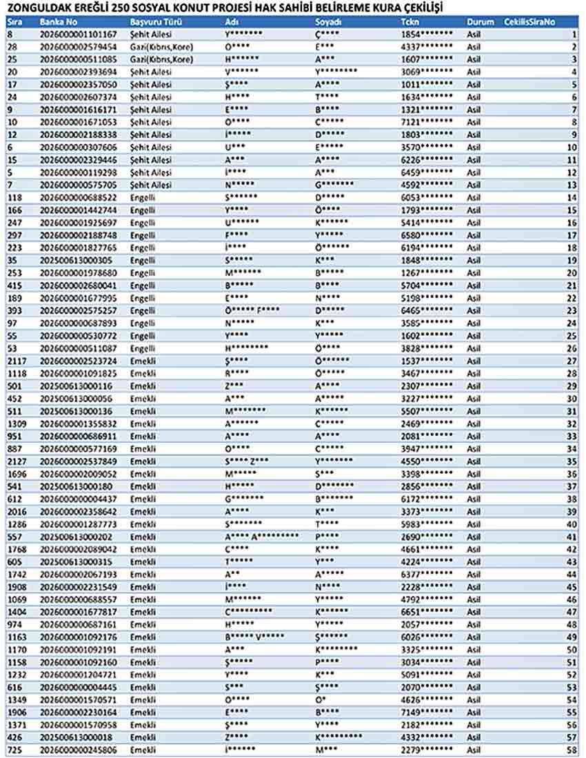 Gerçekleştirilen kura çekiminde EREĞLİ İLÇESİ LİSTESİ