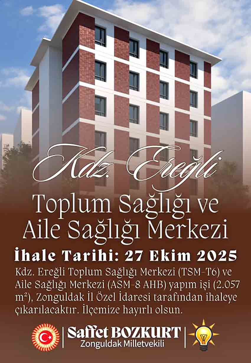 Milletvekili Bozkurt, konuya ilişkin yaptığı açıklamada, "Kdz. Ereğli Toplum Sağlığı Merkezi (TSM-T6) ve Aile Sağlığı Merkezi (ASM-8 AHB) yapım işi (2.057 m²), Zonguldak İl Özel İdaresi tarafından 27 Ekim 2025 Pazartesi günü ihaleye çıkarılacaktır. İlçemize hayırlı olsun" ifadelerini kullandı.