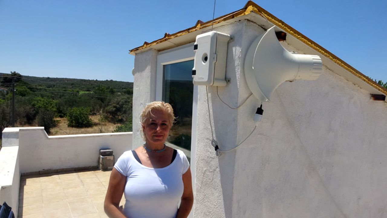 Yazlık evinde yaz kış oturan Ebru Erdönmez, müftülük hoparlörüne zarar verilmesine engel olmak için müftülükçe temin edilen telsiz sistemiyle çalışan cami hoparlörünü evinin çatısına taktırdı.