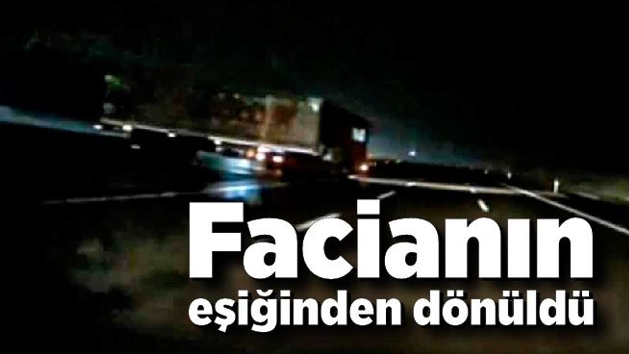 Bolu’da TEM Otoyolu’nda, görevli araçlar harici dönüşün yasak olduğu ‘acil dönüş noktasından’ dönüş yapan bir tır faciaya davetiye çıkarttı. O anlar bir aracın kamerasına yansıdı.