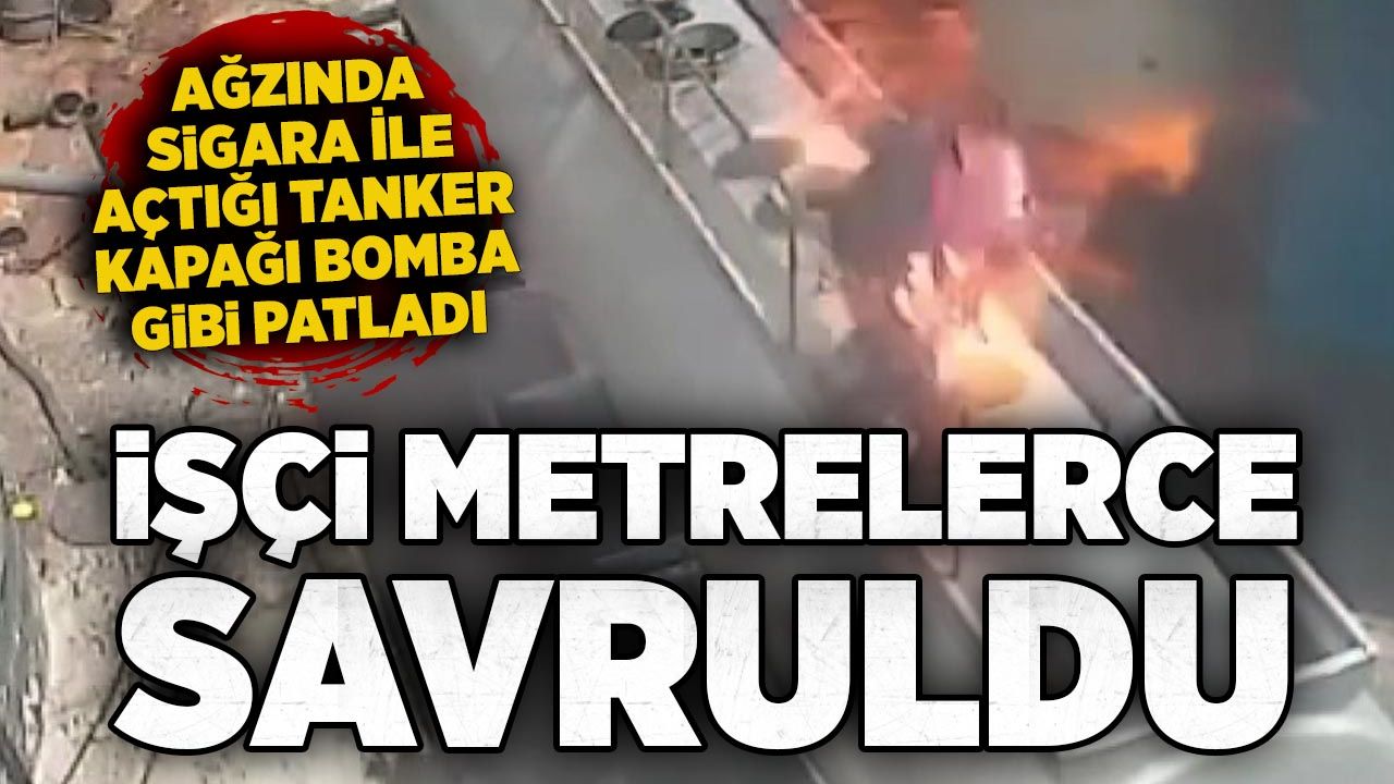 Gaziantep'in Nizip ilçesinde ayçiçek yağı fabrikasında bir işçinin ağzında sigara ile açmaya çalıştığı tanker kapağı bomba gibi patladı. İşçinin metrelerce savrularak ağır yaralandığı patlama anı güvenlik kamerasına yansıdı.