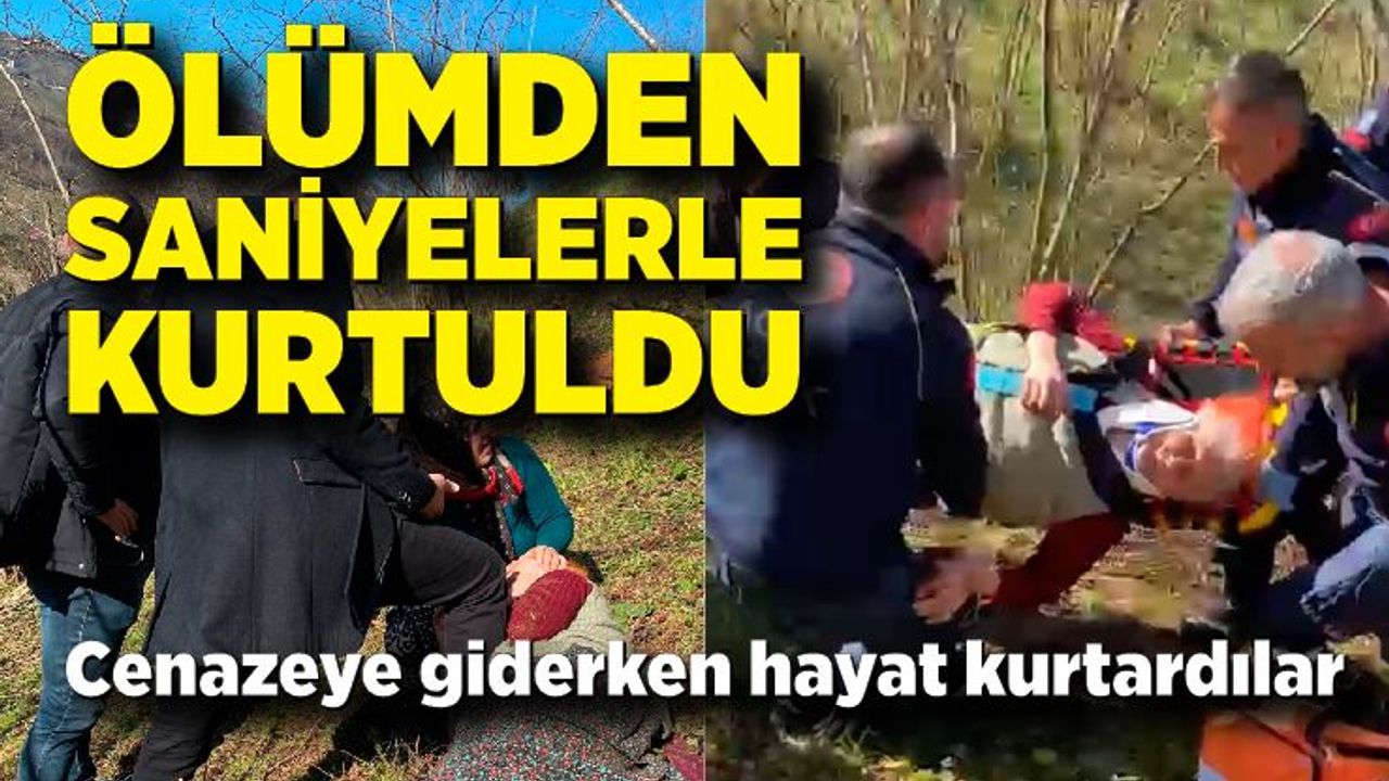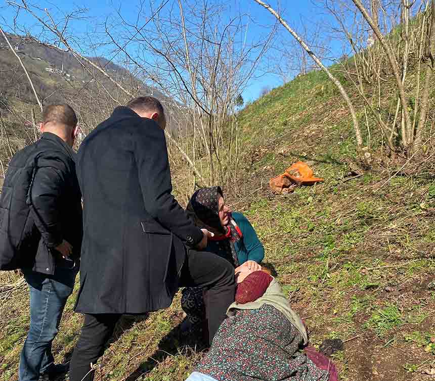 Trabzon’un Vakfıkebir ilçesinde cenazeye katılmak üzere yola çıkan vatandaşların dikkati, fındık bahçesine yuvarlanan yaşlı kadının hayatta kalmasını sağladı.