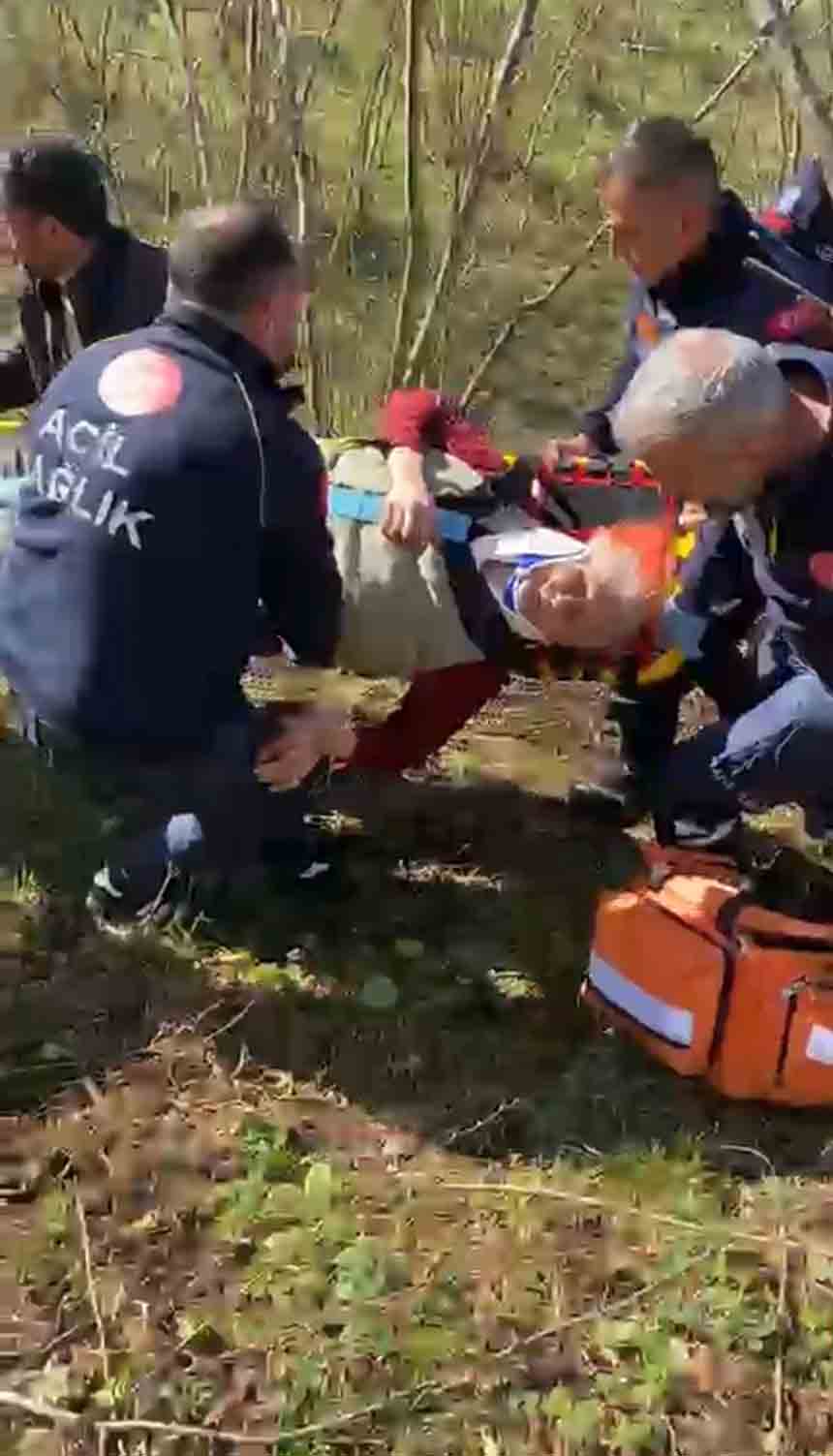 Sağlık ve itfaiye ekipleri, eğimli ve kaygan arazide dikkatli bir çalışma yürüttü. Refika Yüksel, sedyeyle taşınarak ambulansa ulaştırıldı.