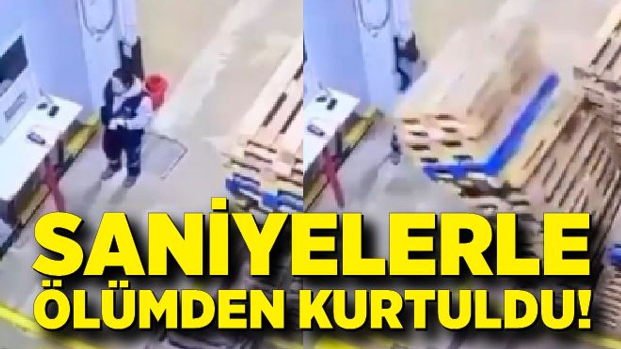 Olay, Bursa'nın Organize Sanayi Bölgesi'nde bulunan bir fabrikada meydana geldi. Edinilen bilgiye göre, depo içinde bulunan bir işçi forkliftle yüklediği paletleri üst üste istiflemek istedi. Ancak son bıraktığı parti dengesiz olunca, paletler yere devrildi. O sırada forkliftin hemen yanında bulunan kadın çalışan, devrilen paletlerin altında kalmaktan kıl payı kurtuldu.