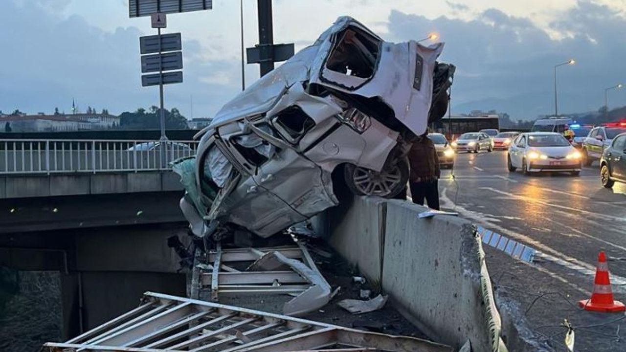 Sürücüsünün kontrolünü kaybettiği kamyon, önünde seyreden otomobile arkadan çarptı. Çarpmanın etkisiyle savrulan otomobil bariyerleri aşarak köprüde asılı kaldı.