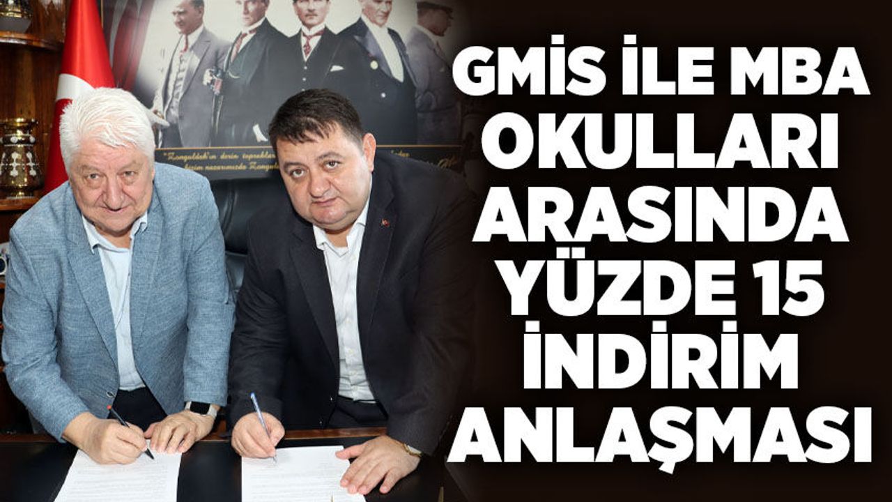 GMİS Genel Başkanı Hakan Yeşil ile Zonguldak MBA Kurucu Temsilcisi Halil Vecdi Ilgın arasında imzalanan kurumsal işbirliği protokolüne göre GMİS üyelerinin çocuklarına 2026-2027 Eğitim-Öğretim Yılı fiyat listesi üzerinden yüzde 15 indirim uygulanacak.