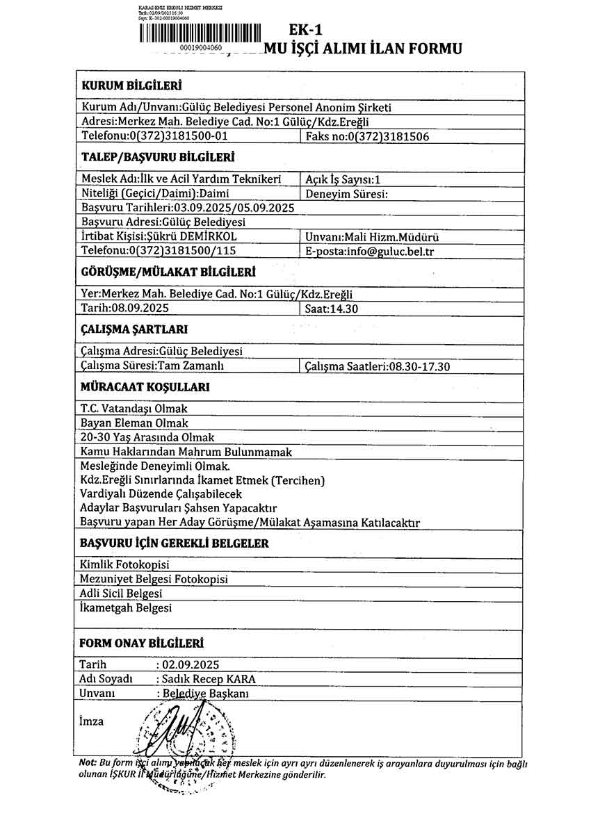 Zonguldak’ın Ereğli ilçesine bağlı Gülüç Belediyesi, bünyesinde görevlendirilmek üzere İlk ve Acil Yardım Teknikeri alımı yapacağını duyurdu. Belediye tarafından yayımlanan ilana göre, açık iş sayısı 1 olarak belirtildi.
