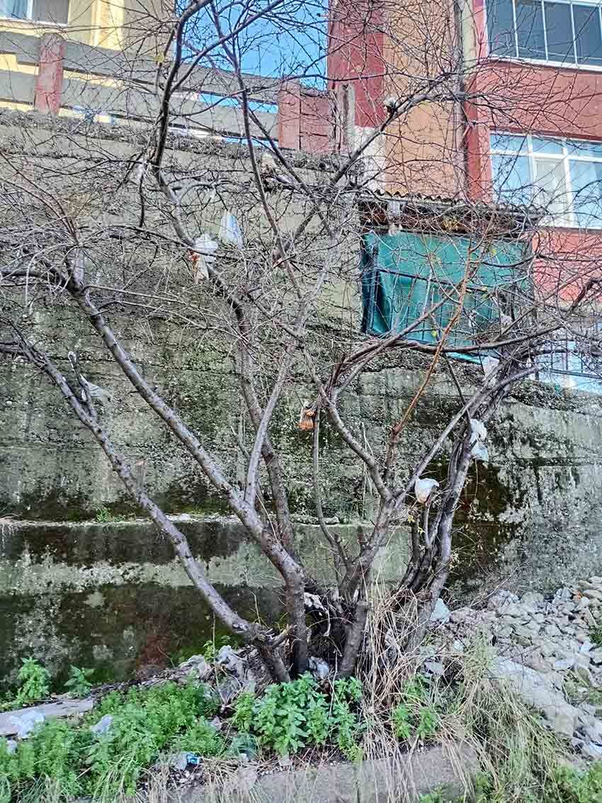 467 Evler semtinin Ahmet Ali Sokak girişinde bulunan bir ağaca aylardan beri yakındaki bir binadan poşetler içinde çöp atılıyor. Bu çöpler de ağacın dallarına asılı kalıp etrafa iğrenç kokular salıyor. Konu semt halkı tarafından gerekli makamlara iletiliyor ama ilgilenen çıkmıyor.