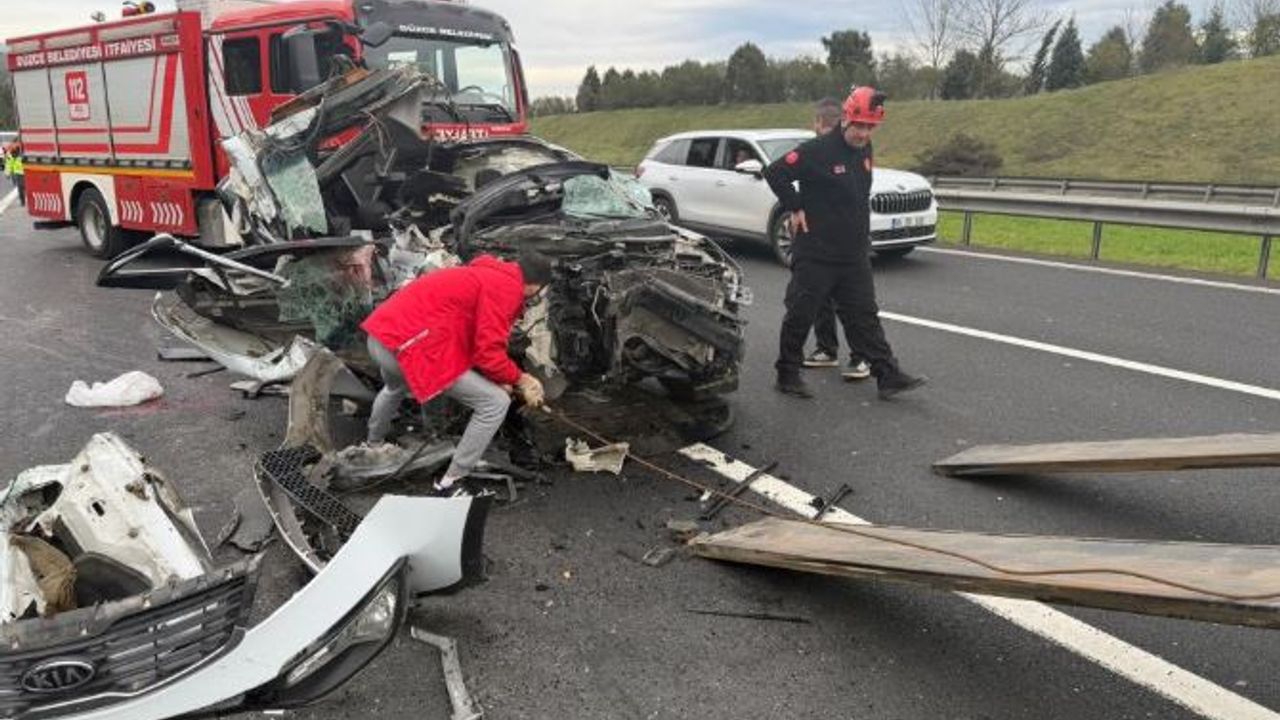 TEM Otoyolu İstanbul istikameti Gümüşova rampalarında saat 14.30 sıralarında meydana gelen kazada, Hamza Güven idaresindeki 34 BZN 727 plakalı otomobil, 34 AZD 564 plakalı tıra çarptı.