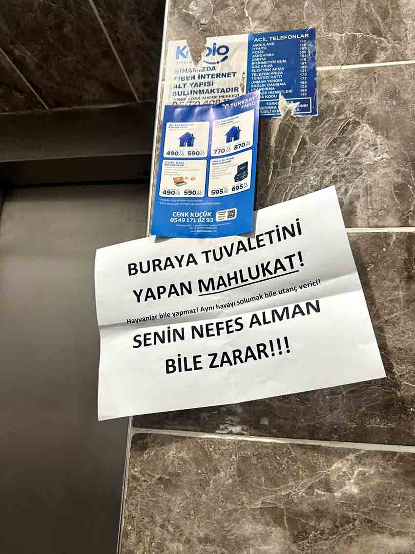 Afişte, “Buraya tuvaletini yapan mahlukat, senin nefes alman bile zarar” ifadelerine yer verilmesi, mahalle sakinlerinin ilgisini çekti. Afişin kim tarafından ve ne amaçla asıldığı henüz bilinmiyor.