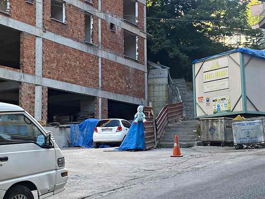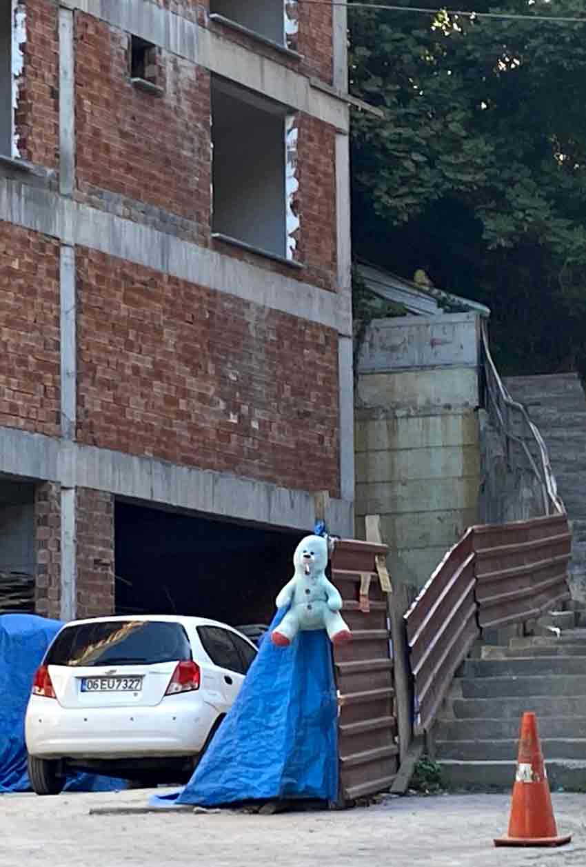 İnşaatın önünden geçen vatandaşlar ve çocuklar, beklenmedik şekilde asılı duran oyuncak ayıyı görünce şaşkınlıklarını gizleyemedi. Vatandaşla, "Oyuncak bekçi inşaatı koruyor” dediler.