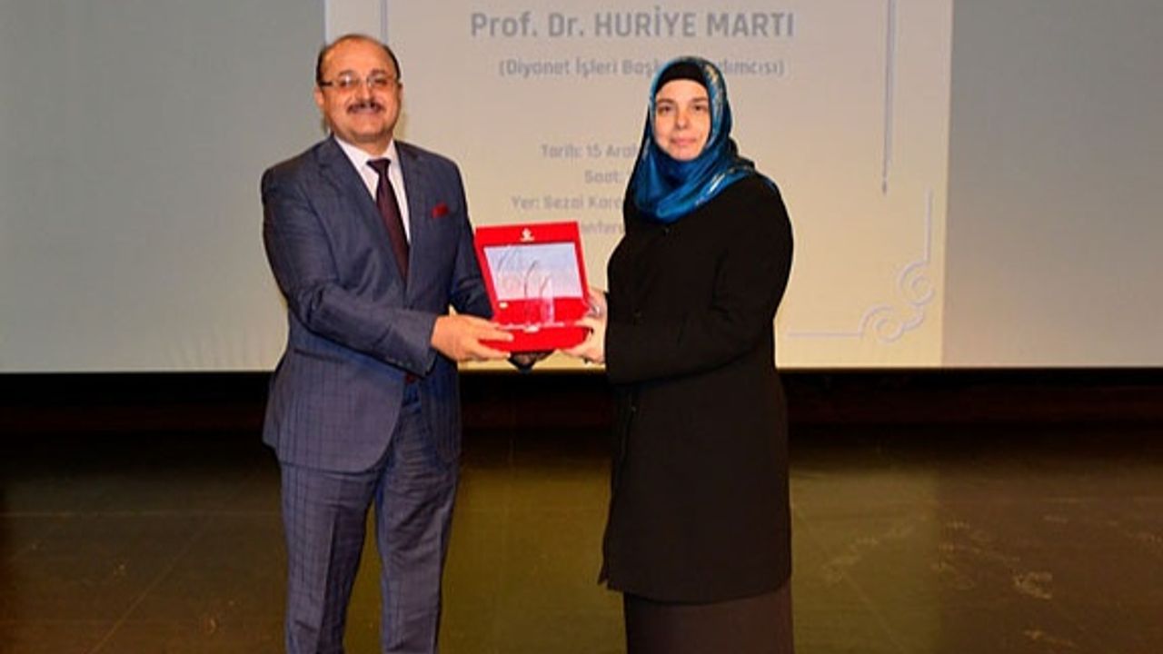 İlahi dinlerin sonuncusu olan İslam ve mukaddes kitabımız Kur’an-ı Kerim’in insanın doğal çevreye bakışını yönlendirmeye ve çevreyle ilişkisini düzenlemeye ayrı bir önem verdiğini vurgulayan Rektör Özölçer, Üniversitemize teşrif ederek İslam ve çevre bilinci konusunda önemli katkılar sunacak olan Diyanet İşleri Başkan Yardımcısı Prof. Dr. Huriye Martı ’ya teşekkürlerini sundu.