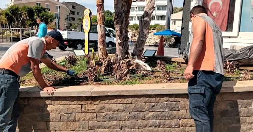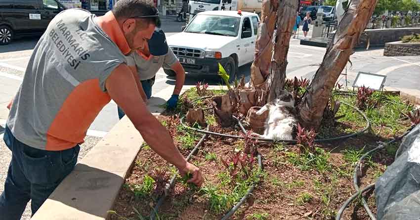 Muğla’nın Marmaris ilçesinde işçiler çevre düzenlemesi yaparken, keyfini bozmayan sokak kedisi görenleri gülümsetti.