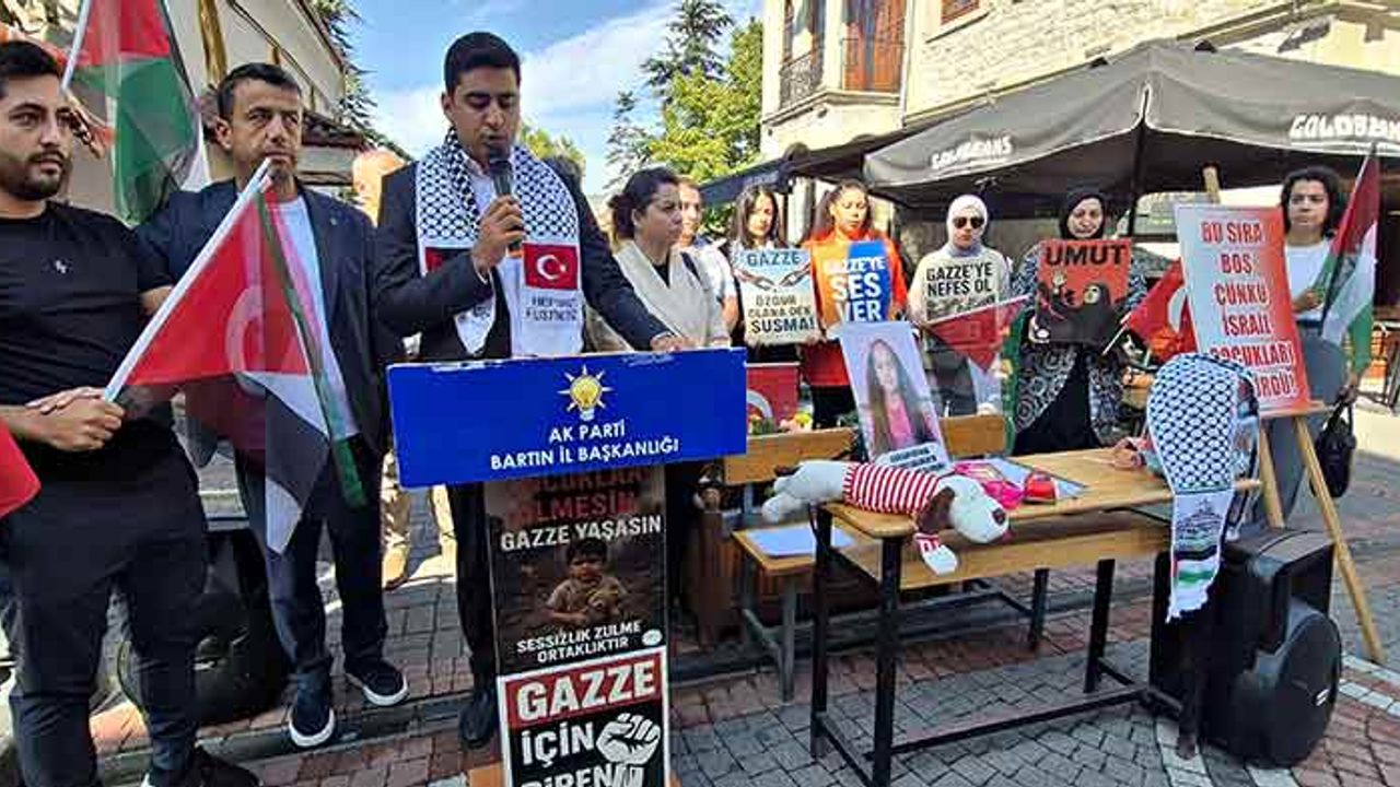AK Parti Bartın Gençlik Kolları İl Başkanı Mahmut Taş, "Bugün ülkemizde yeni eğitim-öğretim yılı başlıyor. Milyonlarca çocuğumuz, gencimiz Ancak Gazze'de manzara bambaşka. Orada binlerce sıra bomboş, çünkü o sıralara oturacak çocuklar artık hayatta değil. Gazze'de binlerce masum çocuk, sıralarına kavuşamadan Katil İsrail, 7 Ekim'den bu yana 19 bin çocuğu katletti. O çocukların çantaları kapının bombalarıyla ellerinden alındı. Katil İsrail çocukların geleceğe açılan kapılarını hedef aldı. arkasında asılı kaldı. Defterleri hiç açılmadı. Kalemleri hiç yazmadı. Hayatları, katil İsrail'in Gazze'de yüzlerce okul yerle bir edildi, sınıflar enkaza döndü, kütüphaneler kül oldu. Çocukların umutla beklediği teneffüs zilinin yerini, bombaların uğursuz sesi aldı. Eğitim, insanlığın en temel hakkıyken, Gazze'de bu hak barbarca yok edildi. Çocukların dünyasıyla birlikte, yarının öğretmenleri, mühendisleri, doktorları da yok edildi