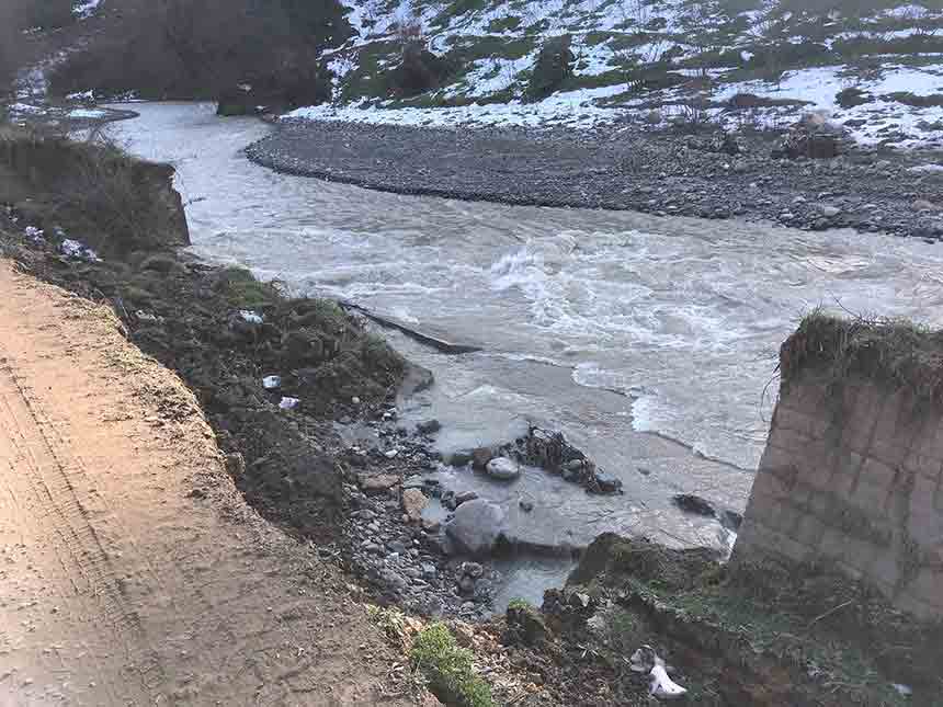 Alaplı’nın Aydınyayla köyü mevkiinde çay yatağı kıyısında yer alan yaklaşık 3 metre yüksekliğindeki istinat duvarı, yoğun yağışlar nedeniyle zeminin yumuşaması sonucunda çöktü. Duvarın uzun bir bölümünün yıkıldığı belirtildi.
