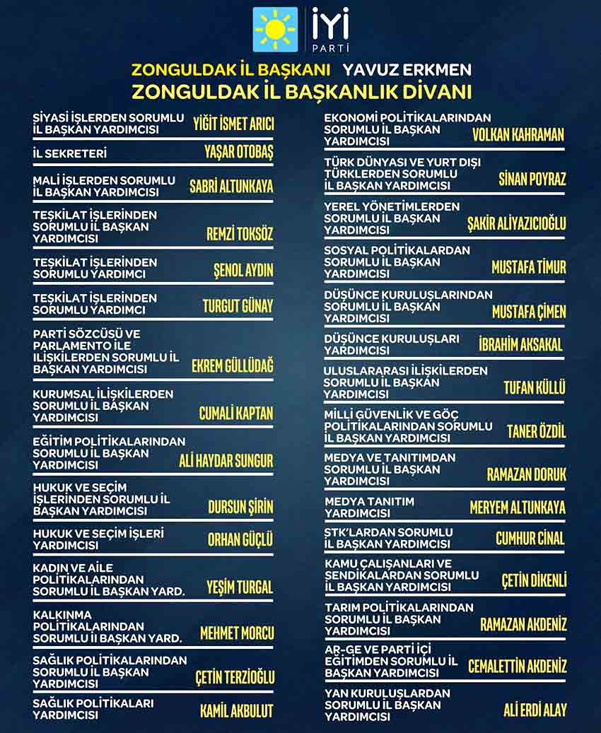 İYİ Parti Zonguldak İl Başkanı Yavuz Erkmen, İl Divan Kurulu’nda görev yapacak isimleri resmen açıkladı. Başkan Erkmen, “Başarı çıtasının her geçen gün bir üst seviyeye yükseltildiğini ve ‘Birlikten Güç Doğar’ anlayışı ile hareket ettiğimizi belirtmek isterim” dedi.