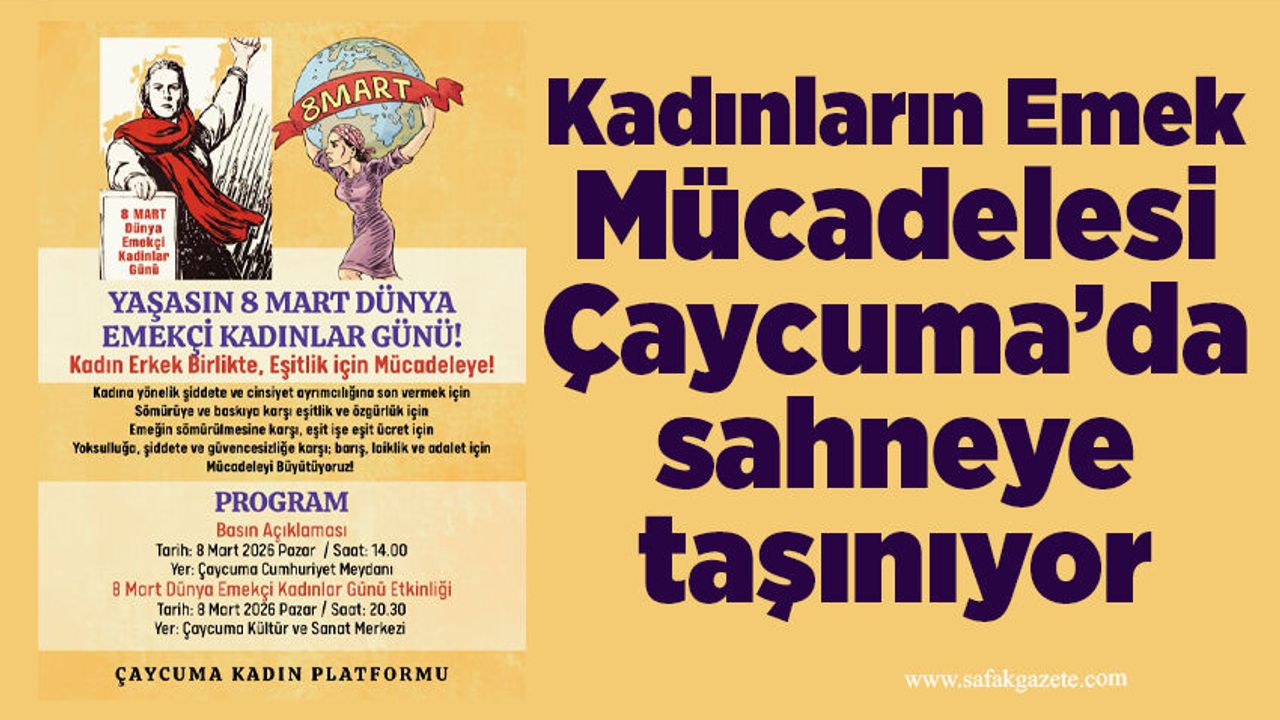 8 Mart Dünya Emekçi Kadınlar Günü’nde Çaycuma’da basın açıklaması ve etkinlik gerçekleştirilecek. 8 Mart 2026 Pazar günü, Çaycuma Kadın Platformu tarafından düzenlenecek kutlama programı kapsamında, ilk olarak saat 14.00’te Cumhuriyet Meydanı’nda basın açıklaması yapılacak. Saat 20.30’da ise Çaycuma Kültür ve Sanat Merkezi’nde “8 Mart Dünya Emekçi Kadınlar Günü Etkinliği” düzenlenecek.