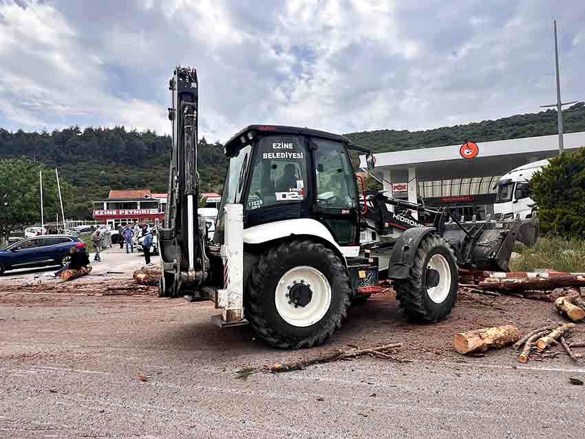 Yola savrulan tomruklar ise Ezine Belediyesi ekipleri tarafından yoldan kaldırılıyor.