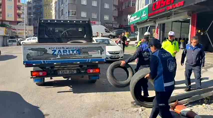 Erdemir ve İbrahim Efe caddelerinde gerçekleştirilen operasyonda, İlçe Emniyet Müdürlüğü ekiplerinin de desteğiyle kaldırımlara konulan plastik duba, tabela, flama, lastik ve çeşitli işgal malzemeleri tek tek toplandı.