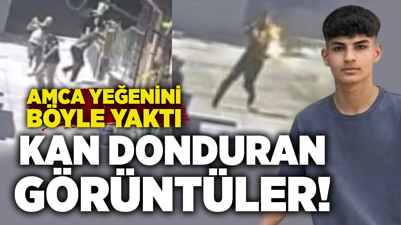 Dehşete düşüren olayın güvenlik kamerası görüntüleri de ortaya çıktı. Amcasının elinde bir şişeyle hızla gelip yanıcı maddeyi yeğeninin üzerine döktükten sonra yakması, gencin ise yanarak koşması güvenlik kamerasına saniye saniye yansıdı.