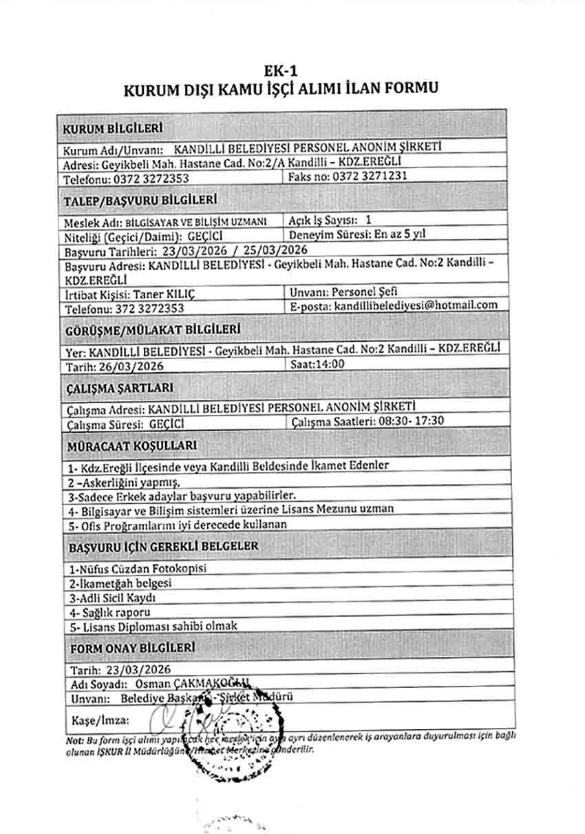 Kandilli Belediyesi tarafından yapılan açıklamada, belediye bünyesinde görevlendirilmek üzere bilgisayar ve bilişim alanında uzman personel istihdam edileceği bildirildi.