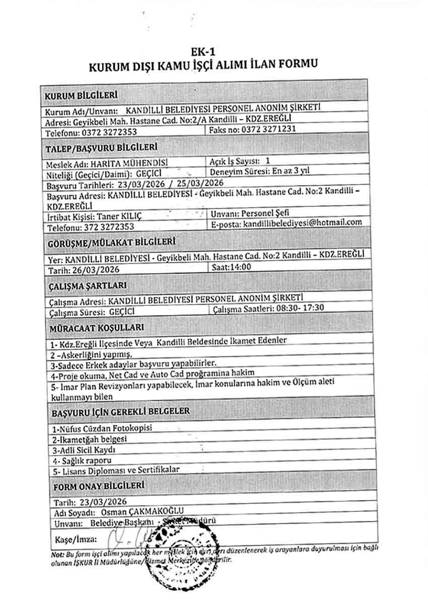 Adayların başvurularını 23-25 Mart tarihleri arasında yapabileceği belirtilirken, başvuru şartları ve detayların belediye tarafından duyurulacağı ifade edildi.