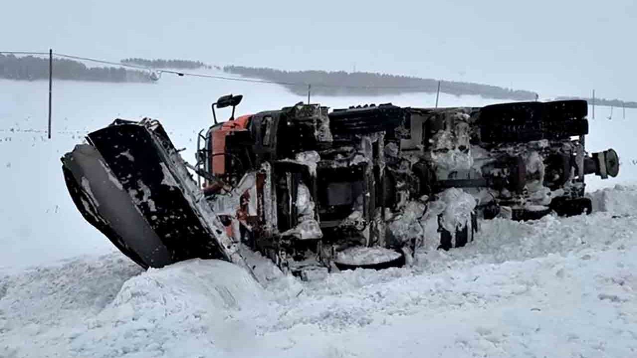 Kar küreme ve tuzlama çalışması yürüten araç, buzla kaplı yolda sürücüsünün kontrolünden çıkarak devrildi. Kazanın ardından yol üzerinde kar ve tuz birikintileri oluştu.