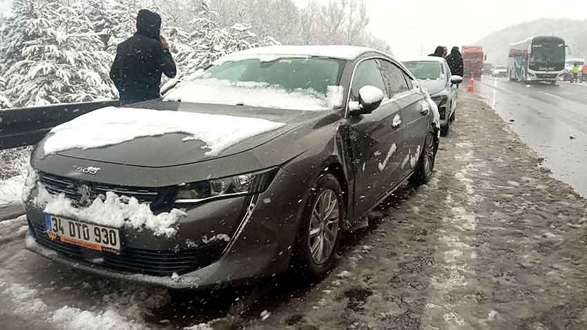 TEM Otoyolu’nun Bolu geçişinde kar yağışıyla sebebiyle kayganlaşan yolda aynı noktada 6 aracın karıştığı üç kaza meydana geldi. Meydana gelen kazalarda 1 kişi hafif şekilde yaralandı.