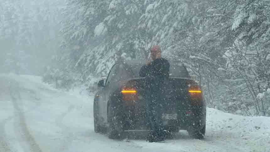 Yoğun kar yağışı nedeniyle yol kısa sürede beyaz örtüyle kaplandı. Bazı araçlar kayganlaşan zeminde ilerlemekte güçlük çekerken, kış lastiği bulunmayan bir otomobil yolda kaldı.