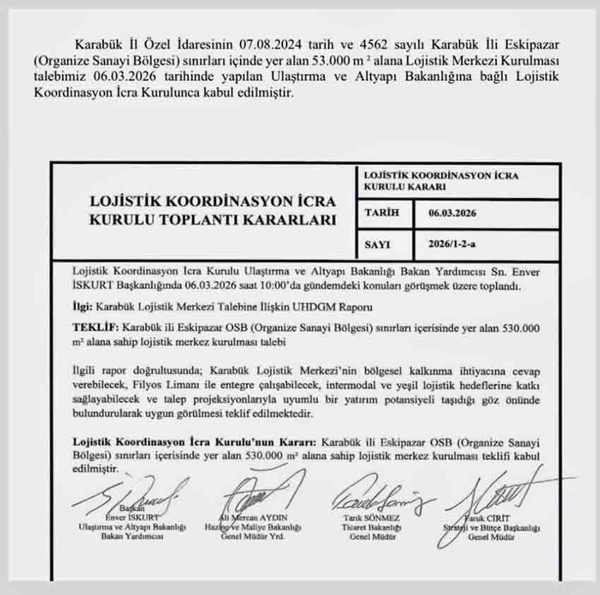 Karabük’te kurulması planlanan Lojistik Merkezi Projesi, Ulaştırma ve Altyapı Bakanlığı Lojistik Koordinasyon İcra Kurulu tarafından kabul edilerek resmen onaylandı. Karabük İl Özel İdaresinin talebi doğrultusunda hazırlanan proje, Eskipazar Organize Sanayi Bölgesi’nde yaklaşık 530 bin metrekarelik alanda hayata geçirilecek.