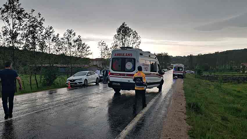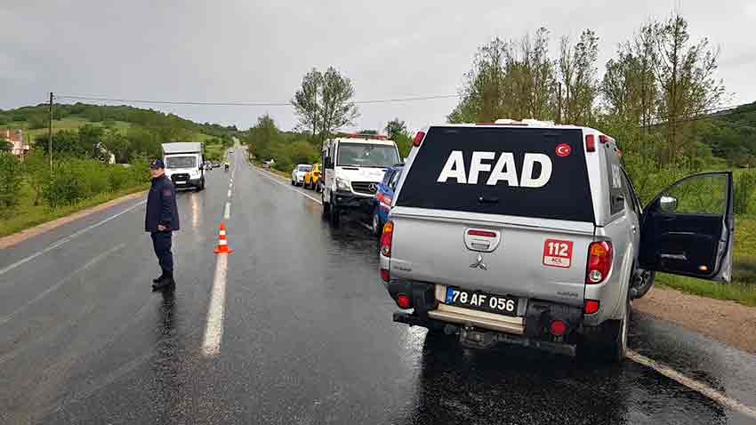 Kaza, Osmanlar Köyü Paşaköprüsü mevkiinde meydana geldi. Özgür Ş. idaresindeki 78 BK 515 plakalı kamyon, yağmur nedeniyle kayganlaşan yolda kontrolden çıkarak önce tali yola giriş yapmak isteyen Mustafa U. idaresindeki 57 DV 518 plakalı hafif ticari araca ardından karşı istikametten gelen Sabri B. (44) idaresindeki 78 M 9007 plakalı işçi servisi ile çarpışıp tarlaya devrildi. Kamyonun çarptığı hafif ticari aracın yol kenarında bekleyen arazi aracına çarpmasına sonucu 4 araçlı zincirleme kaza meydana geldi. Kazada Nebiye U. (65), Büşra U. (29), Selahattin G. (50), Alihan K. (29), Tahir ve Alaattin B., Ahmet D. (48), Barış E. (27) ve Sabri B. yaralanırken ihbar üzerine olay yerine AFAD, polis, jandarma, itfaiye ve çok sayıda ambulans sevk edildi. Sağlık ekiplerinin ilk müdahalesinin ardından yaralılar kentteki çeşitli hastanelere kaldırıldı.