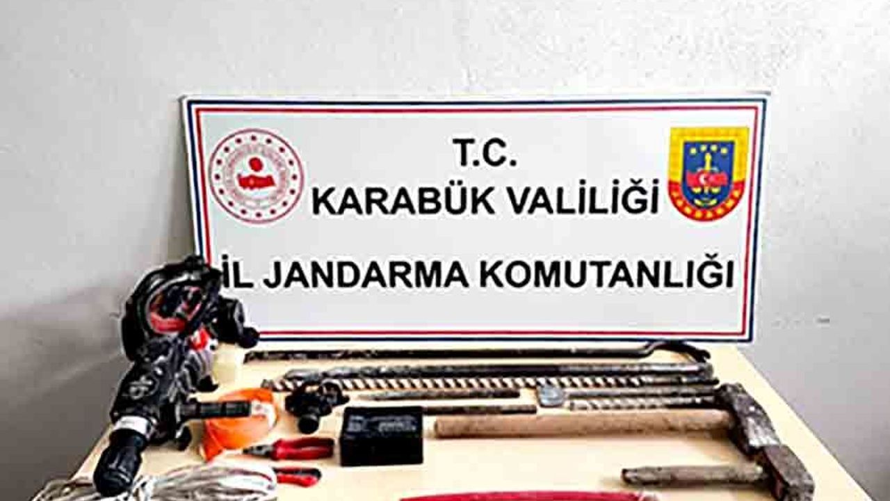 Öte yandan, Safranbolu Cumhuriyet Savcılığı koordinesinde Safranbolu ilçesinde düzenlenen operasyonda, izinsiz kazı yaptığı belirlenen 2 şüpheli suçüstü yakalandı. Şüphelilerin kazı faaliyetlerinde kullandığı 1 adet hilti, 5 adet hilti ucu, 1 adet keski, 1 adet manivela demiri, 1 adet kafa feneri, 1 adet balyoz, 1 adet çekiç, 1 adet pense, 1 adet maket bıçağı, 1 adet halat, 1 adet uzatma kablosu, 1 adet akü ve 3 adet plastik boruya el konuldu.