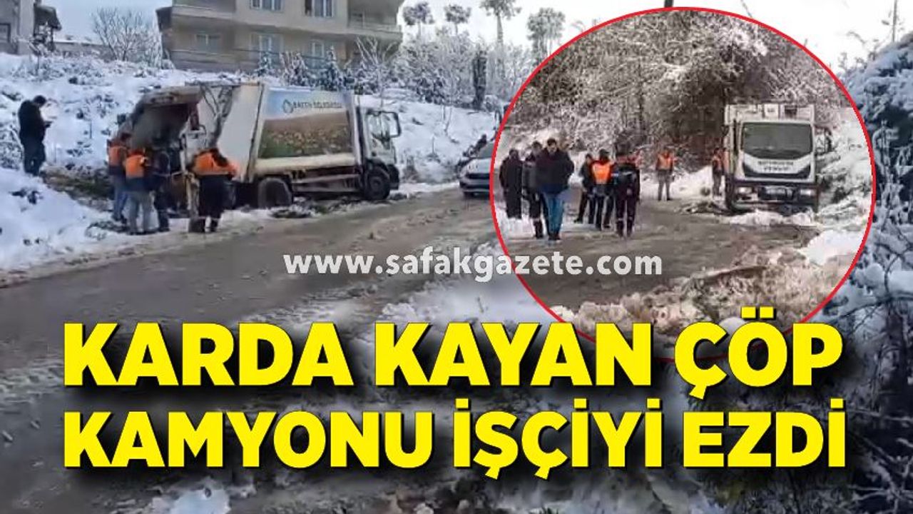 Belediyeye ait çöp kamyonu, karlı yolda ilerlediği sırada kontrolden çıkarak geriye doğru kaydı. Kamyonun arkasında görev yapan belediye işçisi, araç ile toprak zemin arasında sıkıştı.