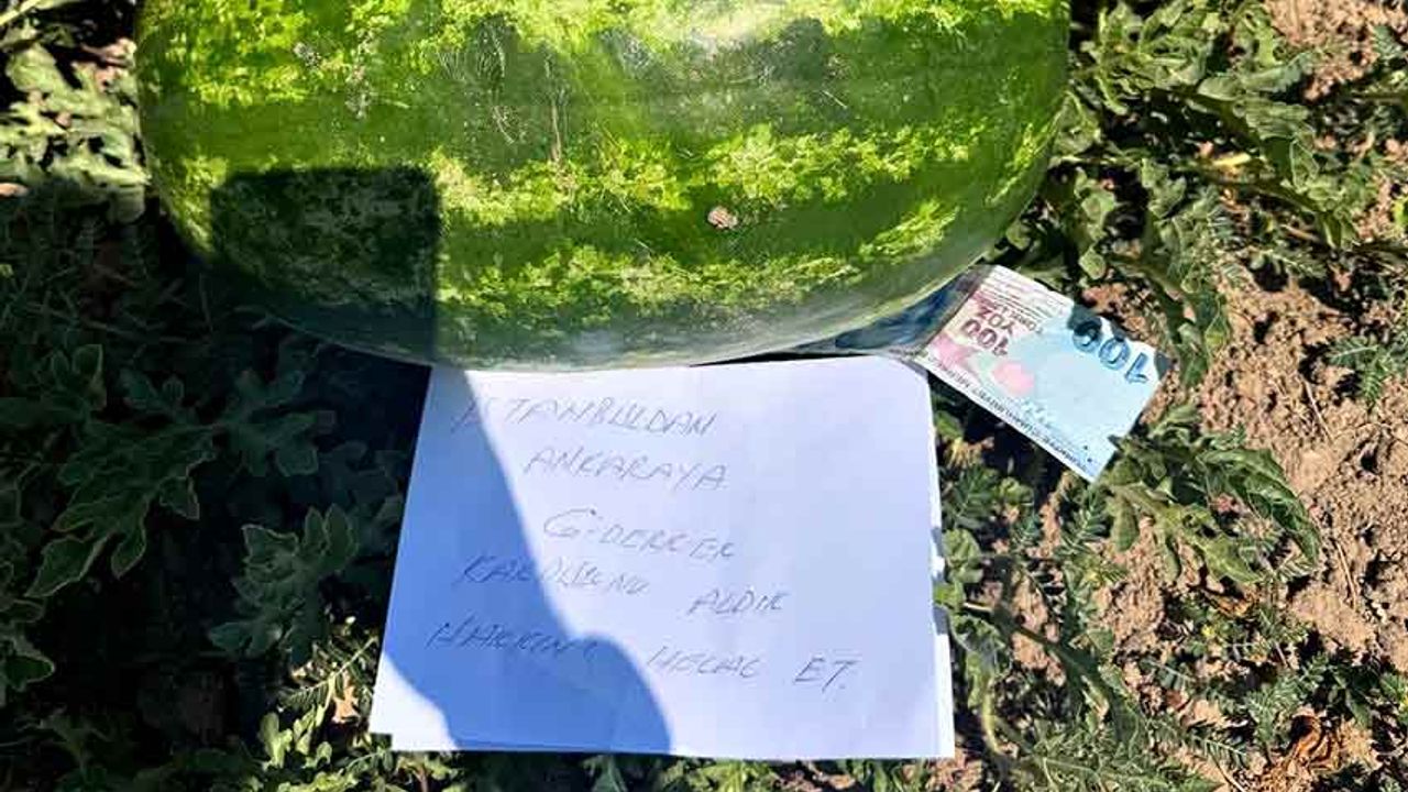 Bilecik'in Osmaneli ilçesinde İstasyon Altı mevkiinde karpuz tarlası bulunan bir üretici sabah tarlasına geldi. Karpuzların arasında gezen tarla sahibi bir karpuzun altında bir not bir de 100 lira para buldu. Notta, "İstanbul'dan Ankara'ya giderken karpuzunuzu aldık, hakkınızı helal edin" yazısını okuyan tarla sahibi duygu dolu anlar yaşadı. Tarla sahibi bu olayı sosyal medya hesabından "Böyle güzel yürekli insanlar hâlâ var mı" notuyla paylaştı.