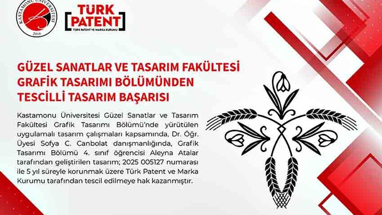 Kastamonu Üniversitesi Güzel Sanatlar ve Tasarım Fakültesi öğretim üyelerinden Dr. Öğr. Üyesi Sofya C. Canbolat'ın danışmanlığında 4. sınıf öğrencisi Aleyna Atalar tarafından hazırlanan tasarım, Türk Patent ve Marka Kurumu tarafından 5 yıl süreyle tescillendi. Çalışma, kültürel mirasın çağdaş grafik tasarım anlayışıyla yeniden yorumlanmasını amaçlıyor. Öğrencilerin yenilikçi üretimlerinin ulusal düzeyde resmî koruma kazanması, uygulamalı eğitimin niteliğini de ortaya koyuyor.