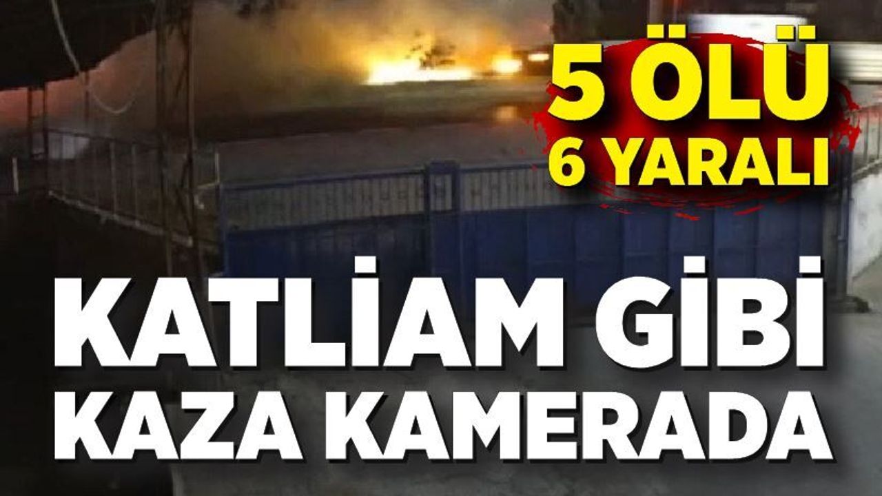Öte yandan 1’i çocuk 5 kişinin yaşamını yitirdiği, 6 kişinin yaralandığı kazanın görüntüleri bir işyerine ait güvenlik kamerasına yansıdı. Görüntülerde otomobilin kontrolden çıkarak karşı şeride geçtiği ve pikapla kafa kafaya çarpıştığı anlar yer aldı.