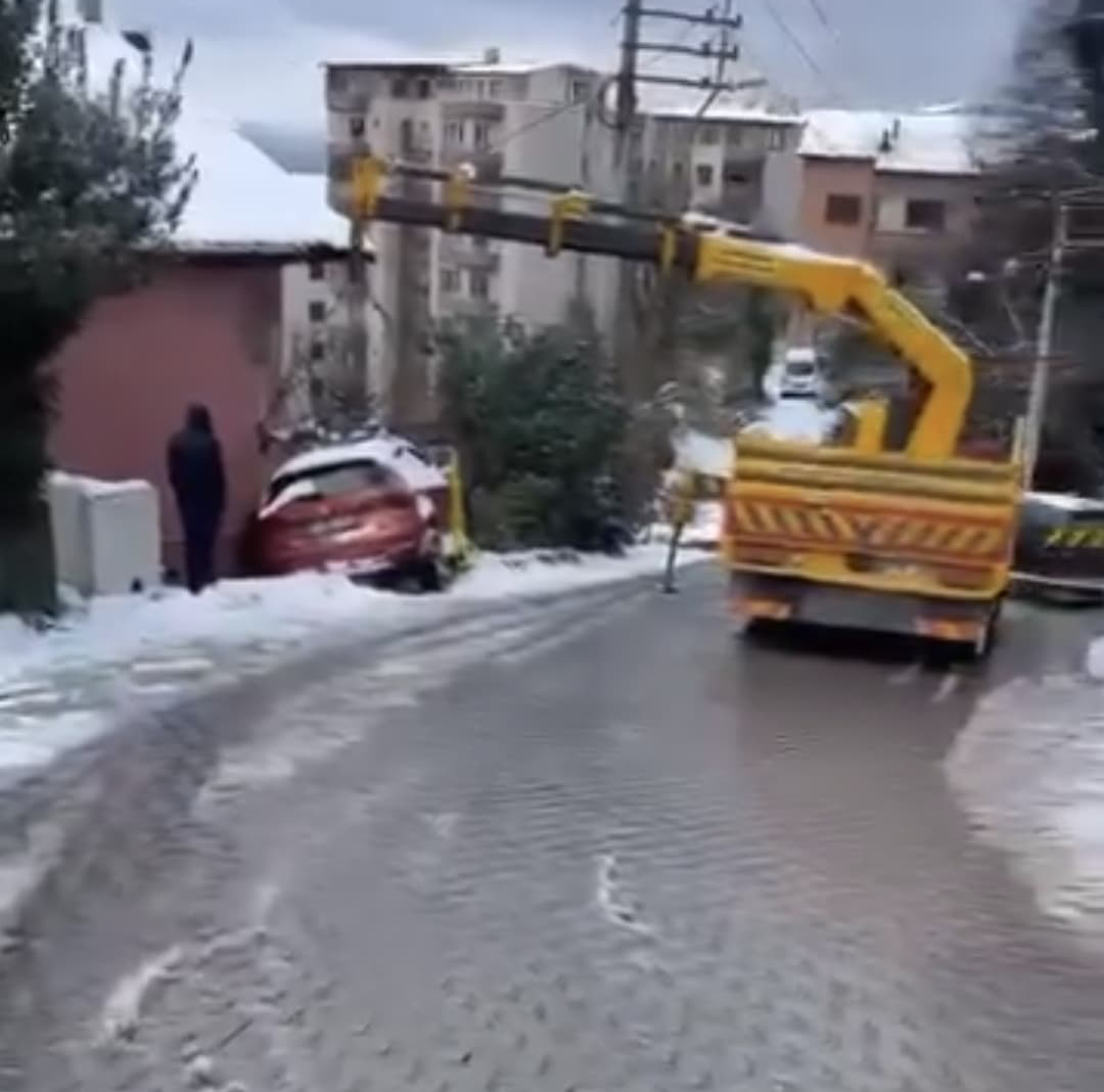Edinilen bilgiye göre Tepebaşı Mahallesi İmam Hatip Lisesi yokuşunda meydana geldi. Kar yağışı sonrası bayırdan inmeye çalışan araç sürücüsü direksiyon hakimiyetini kaybederek tek katlı evin duvarına çarparak durabildi. Kazada şans eseri ölen ya da yaralanan olmazken araçta maddi hasar meydana geldi. Kaza sonrası olay yerine gelen vinç araç düştüğü yerden kurtarıldı.