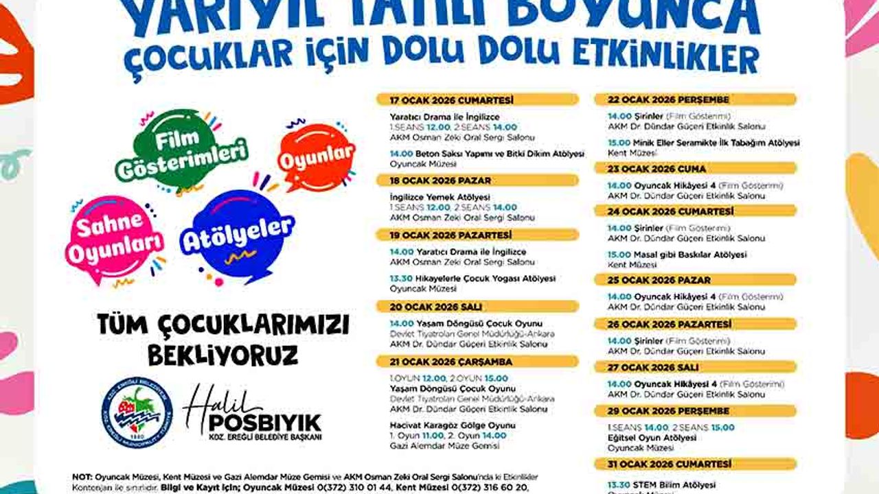 Karadeniz Ereğli Belediyesi, çocukların ara tatil dönemini verimli, eğlenceli ve öğretici bir şekilde geçirmeleri amacıyla kapsamlı bir etkinlik program hazırladı. 17–31 Ocak tarihleri arasında gerçekleşecek etkinlikler kapsamında; tiyatro ve çizgi film gösterimlerinden, atölyelere uzanan zengin bir içerik çocuklar ve ailelerle buluşacak.