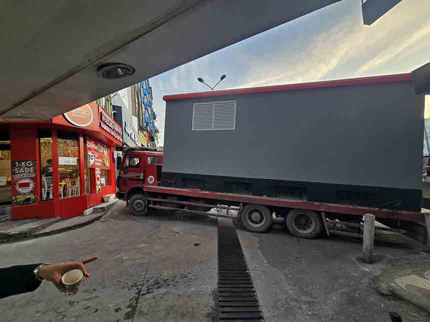 Trafo yüklü kamyonun yönlendirilmesi için iş makinesi desteği kullanıldı. İş makinesi yardımıyla döndürülmeye çalışılan kamyon, hem araç trafiğini hem de bölgede bulunan yayaları tehlikeye attı. Yaşanan durum çevredeki vatandaşların da tepkisine neden oldu.