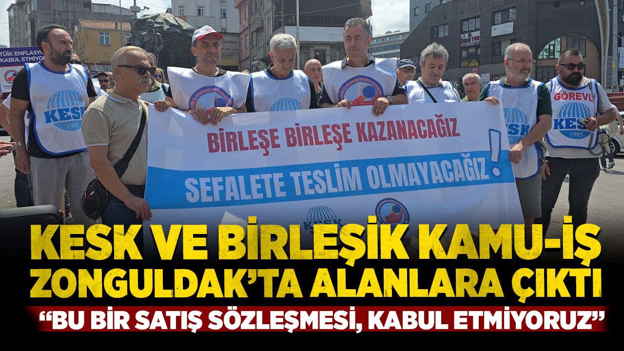 Kamu Emekçileri Sendikası Konfederasyonu (KESK) ve Birleşik Kamu İş Konfederasyonu, Zonguldak’ta Madenci Anıtı önünde gerçekleştirdikleri basın açıklamasıyla hükümetin 2026–2027 yıllarına yönelik toplu sözleşme teklifini protesto etti.