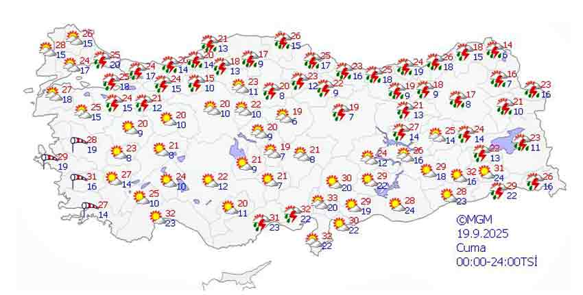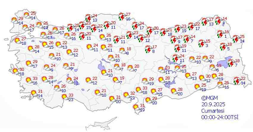 Meteoroloji Genel Müdürlüğü'nden (MGM) alınan verilerine göre, Karadeniz Bölgesi'nde 18, 19 ve 20 Eylül tarihlerinde sağanak ve gök gürültülü sağanak yağışlar bekleniyor. Sakarya'dan Artvin'e kadar olan bölge genelinde gök gürültülü sağanak yağışlar etkili olacak. Gök gürültülü sağanak yağış zaman zaman 3 gün boyunca yerini kuvvetli sağanak yağışlara da bırakacak. Sıcaklıklar gündüzleri 20-25 derecelerde seyrederken, geceleri 14-17 dereceye kadar düşeceği tahmin ediliyor.