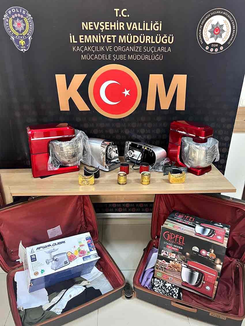 Nevşehir Kapadokya Havalimanı’ndan yurda girmek isteyen 5 yabancı uyruklu şahsın getirdiği kıyma ve hamur karma makinelerinden tam 61 kilo 121 gram kaçak altın ele geçirildi.